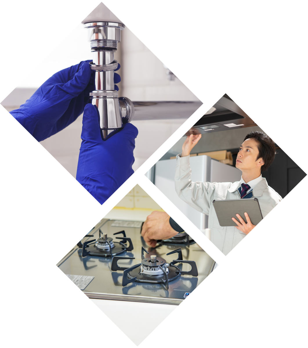 緊急の排水詰まり通管作業や水漏れ修繕 水栓 ユニットバス キッチン 洗面 トイレ等の水回り設備、電気工事 換気扇 IHコンロ エアコン等の空調設備、給湯器、ガスコンロ等のガス器具設備の総合住宅設備工事を得意としており、その他、退去後の原状回復工事やリノベーション工事で快適な住空間をお届けいたします。